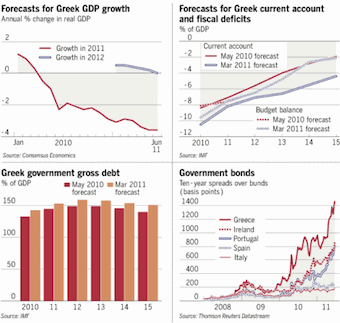Хуже всего то, что такие скачки спрэда происходят на фоне относительного улучшения экономической активности. В рамках первоначально оговоренной программы предполагалось, что валовой внутренний продукт Греции в 2010 году может сократиться на 4%, затем последует падение на 2.6% в 2011 году. Однако в отчете, опубликованном в марте 2011 года, говорится о том, что падение составило 4.5% и 3% соответственно. Общий дефицит правительства, согласно первоначальным прогнозам, должен был составить 8.1% от ВВП в 2011 году и 7.6% от ВВП в 2011 году. Фактические показатели по данным на март 2011 года составили 9.6% и 7.5%. Даже дефицит текущего счета не превысил 10.5% на 2010 год и 8.2% на 2011 год, что лишь незначительно выше первоначальных прогнозов на уровне 8.4% и 7.1% соответственно.