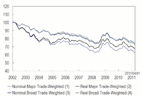 Примечание: 1 — Номинальный взвешенный по торговле валютный курс доллара против основных валют; 2 — реальный взвешенный по торговле валютный курс доллара против основных валют; 3 — номинальный общий курс доллара, взвешенный по торговле; 4 — реальный общий курс доллара, взвешенный по торговле. Источник: Совет ФРС и CIRA.