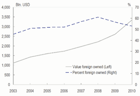Желание американских политиков предотвратить резкое падение доллара или обвал его внешней стоимости вполне понятно. Оно объясняется тем, что девальвация валюты США (или ожидание такой девальвации со стороны участников рынка), скорее всего, будет сопровождаться стремительным ростом доходности по долгосрочным гос. облигациям, а увеличением ряда государственных и частных процентных ставок, которые определяются в соответствии с доходностью. Снижение курса доллара сокращает доходность в по долларовым инвестициям местной валюте для иностранных инвесторов, таким образом, чтобы заставить их сохранить свои вложения в гос. облигации, не говоря уже о новых инвестициях, нужно повысить доходность. За последние десять лет иностранные вложения в американский государственный долг резко возросли. С 2004 года они превышают 50% от общего объема (рис. 2). Опасения относительно внешней стоимости доллара также связаны с его статусом резервной валюты и, в принципе, рисками американкой банковской системы в иностранной валюте. На самом же деле, большинство обязательств американских банков представлены в долларах.