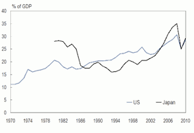 Рис 3. США и Япония - открытость (% от ВВП), 1970-2010