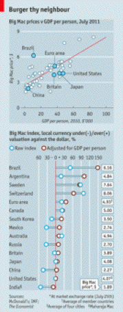 Средний доход в Китае не превышает одной десятой от доходов среднестатистического американца, поэтому, согласно экономической теории, валютный курс юаня должен быть ниже паритета покупательской способности (то есть, курса, который бы уравнял стоимость гамбургера в двух странах). Паритет указывает на то, куда должен двигаться валютный курс в долгосрочной перспективе, по мере развития экономики Китая, но он малоинформативен в отношении текущего равновесного курса. Однако взаимосвязь между ценами и ВВП на душу населения можно, вероятно, использовать для оценки текущей справедливой стоимости валюты. На графике показана «линия оптимального соответствия» между ценами на Биг-Мак и ВВП на душу населения в 48 странах. Разница в цене, показанная красной линией для каждой страны, рассчитаа с учетом дохода на душу населения, а фактическая цена позволяет лучше сориентироваться в понятиях недооцененности и переоцененности, чем «сырой» индекс паритета покупательской способности. Новый рецепт с компонентом ВВП на душу населения говорит о том, что бразильский реал на 100% переоценен. Евро переоценен на 36% против доллара. Более того, наш улучшенный индекс помогает пролить немало полезного света на проблему неконкурентоспособности некоторых стран Еврозоны. При сравнении цен на гамбургеры в странах региона, скорректированный индекс Биг-Мак показал, что «валютные курсы» Италии, Испании, Греции и Португалии существенно переоценены по сравнению с Германией. Юань же близок к своему равновесному уровню по отношению к доллару, при этом обе валюты недооценены против многих других.
