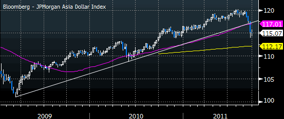По мере того, как в среде инвесторов растут опасения относительно того, что европейским политикам не под силу будет договориться о принятии действенных мер по преодолению долгового кризиса в Европе и последний приобретет неконтролируемый характер, перспективы развития событий в азиатском регионе также стали приобретать менее благоприятный оттенок. Ослабление роста экономик стран Азии является реальной угрозой, и стратеги Citigroup полагают, что в ближайшем будущем азиатские валюты ждет дальнейшее ощутимое ослабление. В банке отмечают, что в пользу такого сценария развития событий говорит и техническая картина: азиатский индекс доллара Bloomberg-JPMorgan закрылся ниже 55-недельной скользящей средней, а также пробил линию тренда 2009/2010 годов. Теперь под прицелом медведей оказалась 200-недельная SMA в районе 112.17, тогда как потенциально он может достичь уровней вблизи 104. Источник: ProFinance.Ru - Новости рынка Forex