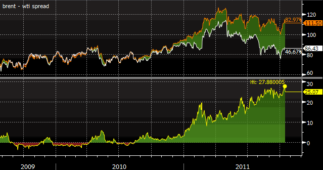 Между тем, если ближайшие перспективы нефти как актива в целом не внушают оптимизма, ситуация на европейском и американском рынках довольно существенно отличается. C осени 2010 года brent была стабильно дороже WTI, при этом спрэд в последние месяцы демонстрировал рост и в пятницу достиг $27.88 за баррель. В начале года объяснением этому служили высокий запасов в США и страхи относительно переполненности запасов в хранилище Кашин, откуда производятся поставки по фьючерсам, торгуемым на Nymex. Тем не менее, с начала лета как общий показатель, так и запасы в Кашин устойчиво снижались (последние достигли минимальных уровней с 1 квартала 2010), и основным драйвером расширения спрэда между brent и WTI стало падение запасов нефти в Европе на фоне войны в Ливии и роста геополитической напряженности на Ближнем Востоке (не считая сбоев в производстве в Северном Море) - пятничный пик спрэда стал следствием новостей о том, что уровень запасов достиг минимальных значений за последние девять лет.