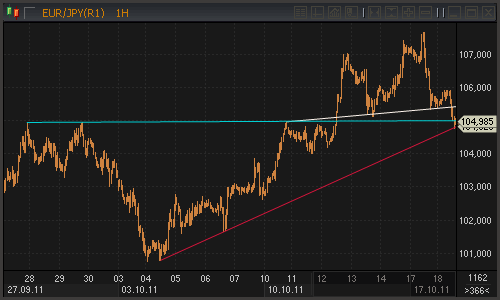 Инвесторы могут предпринять попытку купить евро по отношению к иене, поскольку темпы снижения этой пары валют оказались слишком быстрыми, говорится в комментариях Shinsei Bank. «Европейская валюта перепродана, поэтому может найти покупателей на попытках продолжить снижение», - утверждает Такако Масай, главный управляющий рынками из Shinsei Bank. В тоже время техническая картина в паре евро/иена намекает на формирование разворота, установленной с начала октября, восходящей тенденции, хотя пока фактов однозначного подтверждения пока нет. На ниже представленном графике, белая линия является «линией шеи» предполагаемой фигуры «голова и плечи». В настоящий момент курс торгуется в области очень важных уровней поддержки: горизонтальная линия максимумов конца сентября и линия поддержки текущего восходящего тренда с начала октября. Даже если фигура «голова и плечи» действительно будет реализована, в настоящий момент нельзя исключать возможность возращения к ней и тестирования ее в качестве сопротивления (область значений 105.50).Источник: ProFinance.Ru - Новости рынка Forex