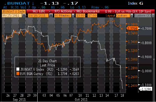 Многомесячная корреляция между парой евро/доллар и спредом доходности немецких и французских 10-летних бондов «развалилась» 10 октября, и продолжает уходить в отрицательную зону на фоне достижения указанным спредом исторического максимума. Принимая во внимание высокую вероятность понижения кредитного рейтинга Франции в ближайшее время, а также серьезные проблемы на рынке межбанковского кредитования в Европе, текущее укрепление единой валюты может оказаться под угрозой. Как следует из приведенного ниже графика, «справедливая» цена пары евро/доллар в настоящий момент находится в области $1.24, что на 14 фигур ниже текущих уровней.