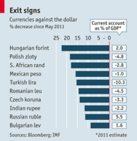 Осушение кредитных линий также больно ударит по валютам стран, рассчитывающих на иностранный капитал, усложнит для них задачу снижения ставок для стимлурирования экономик. Валюты некоторых развивающихся стран уже снизились за последние несколько месяцев (см. график). Крупная распродажа в сентябре предупреждает нас о грядущих неприятностях, считает Стивен Иен из хеджевого фонда SLJ Macro Partners. В этом есть какая-то ирония. Проблемные страны Еврозоны, такие как Италия, пытаются справиться с ограничениями валютного союза, а развивающиеся страны, между тем, (и некоторые развитые, такие как Япония и Швейцария) уже давно не знают, как вернуть себе контроль над плавающими валютными курсами. Бразилия ввела налог на "летучие" виды иностранных капиталов, чтобы остановить рост реала. Турция в прошлом году предприняла ряд нетрадиционных мер, чтобы сдержать приток капитала и ослабить восходящее давление на лиру. Чтобы охладить кредитный бум, власти вынудили банки увеличить свои денежные резервы и ввели лимиты для соотношения стоимости недвижимости к сумме кредита. Эти действия можно считать альтернативой повышения ставки (которое может привлечь новый капитал в страну). Центробанк Турции также проводил интервенции на валютном рынке, чтобы остановить лиру.