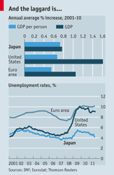 Японцы утверждают, что страдают экономическим расстройством под названием «структурный пессимизм». По ту сторону океана Японию также считают предвестником всего самого мрачного в экономиках Еврозоны и Америки. И это несмотря на то, что данные, опубликованные 14 ноября, продемонстрировали в третьей четверти годовой рост в 6%, что является достаточно быстрым восстановлением после мартовского цунами и атомной катастрофы. И все же, окиньте беспристрастным взглядом ретроспективу японской экономики за последние десять лет, и определение «второе потерянное десятилетие», если не первое, покажется неверным. Многое из того, что порочит японский образ, вызвано демографией (больше чем половине населения страны 45 лет), а также слабой политикой борьбы с этим. И даже при этом, за последнее десятилетие большинство японцев стало богаче. В совокупности, японская экономика выросла примерно вполовину меньше американской между 2001 и 2010 годами. И все же, если судить по росту ВВП на человека за тот же период, то Япония продемонстрировала лучшие показатели по сравнению с Америкой или Еврозоной (см. график 1). Отчасти это вызвано уменьшением населения Японии, в то время как численность американских жителей возросла. Согласно токийскому филиалу Азиатской организации продуктивности, несмотря на то, что темпы роста производительности труда упали немногим меньше чем в Америке в период с 2000 до 2008, общий коэффициент продуктивности – значение того, как страна использует капитал и труд – вырос быстрее. Уровень безработицы в Японии выше чем в 2000 году, однако он составляет примерно половину от значений Америки и Европы (см. график 2).