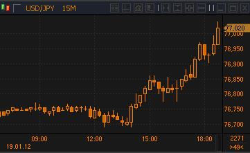 В ходе американских торгов доллар устанавливает свежие максимумы против японской иены, чему способствовала публикация отчетов США. Данные продемонстрировали восстановление рынка труда, однако рынок недвижимости остается в достаточно уязвимом положении. Дилеры сообщают, что активным покупателем пары выступил один из британских клиринговых банков. Пара прорвалась выше семьдесят седьмой фигуры и коснулась отметки Y77.04. Активизации медведей следует ожидать в области Y77.10/15, где уровень Y77.14 является максимумом 16 января. Тестирование указанного уровня способно открыть дорогу движению по направлению к Y77.35/40. Текущий курс доллар/иены Y77.02. Источник: ProFinance.Ru - Новости рынка Forex