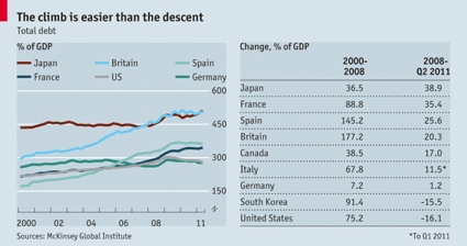 Северные страны выгодно отличаются своими былыми успехами в вопросах сокращения долга. В отчете McKinsey приводится два наиболее ярких примера: опыт Швеции и Финляндии после банковских кризисов в начале 1990-х. Долг снижался в два этапа. На первом этапе частный сектор избавился от своих долгов; экономика при этом оставалась ослабленной, а уровни гос. долга росли. На втором этапе началось восстановление экономического роста и длительный процесс снижения долговой нагрузки на уровне государства. В обеих странах экономика во многом полагалась на процветание экспортного сектора, чего на этот раз не предвидится. Но Швеция начала сокращать дефицит только после восстановления экономики; Финляндия попробовала преждевременно запустить программу консолидации, чем спровоцировала новый приступ рецессии. Аналитики McKinsey тщательно избегают упоминания о том, что политика фискальной консолидации, насаждаемая в Европе, в корне ошибочна. По их словам, сегодняшние условия отличаются от того, что было в начале 1990-х: европейские правительства стартуют с более высокими уровнями долга и дефицита, что не оставляет им места для маневра. Но суть ясна. Америка ближе к успешной шведской модели выхода из кризиса, чем Европа. Сократить долг, не имея возможности опереться на экономический рост, крайне слжно, а масштабы фискальной консолидации в Европе таковы, что этому росту просто не откуда взяться.