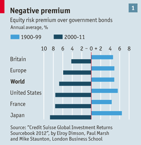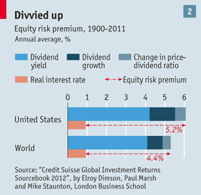Как можно оценить будущую прибыль инвесторов в акции в историческом контексте динамики премии за риск? Институт дипломированных финансовых аналитиков опубликовал новую серию докладов на эту тему. Данная работа является продолжением аналогичного исследования, проведенного в 2001 г., когда диапазон оценок размера премии варьировал от 0 до 7% годовых. Первым шагом является более точное определение премии за риск по акциям. Димсон, Марш и Стонтон выделили здесь следующие компоненты: дивидендная доходность, плюс реальные темпы роста дивидендов, плюс или минус любые изменения в соотношении рыночная цена/сумма дивидендов (величина, обратно пропорциональная дивидендной доходности), минус реальная безрисковая процентная ставка. За период с 1900 по 2011 г., средний показатель дивидендной доходности в мире равнялся 4,1%; реальные темпы роста дивидендов составляли всего 0,8%; рыночная переоценка добавила сюда 0,4%. В результате реальная прибыль на акционерный капитал составила 5,4% (это геометрическое, а не арифметическое вычисление). За вычетом безрисковой процентной ставки, значение ERP оказалось на отметке 4,4% против краткосрочного госдолга и 3,5% против долгосрочных долговых обязательств государства.