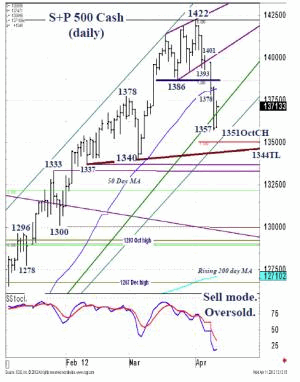 Общая картина (1367): Индекс S&P 500 достиг максимума на уровне 1422 второго апреля, подтвердив и опровергнув наши целевые уровни на середину года (1400-1440), при этом, на месячном графике сохраняется угроза медвежьего разворота в апреле пока индекс держится ниже отметки 1408.  Следует вспомнить о том, что середины марта европейский рынок акций демонстрирует явную слабость, а компании промышленного и сырьевого сектора S&P уже много недель сильно отстают от рынка. Удивительно, что в этих условиях S&P 500 вообще сумел продержаться выше уровня 1400 и опустился ниже всего несколько дней назад (пока индекс торгуется ниже 1400, мы придерживаемся краткосрочного медвежьего прогноза). На наш взгляд, это банальная 5-8% коррекция от максимума 2 апреля на уровне 1422 (SPX изящно остановился рядом с верхней линией канала, сформированного движением в июле 2010 - октябре 2011 на уровне 1417. Игра в одни ворота закончена. Теперь нас ждут долгие месяцы вялой консолидации в диапазоне. Гипотеза о циклическом медвежьем рынке подтвердится только в том случае, если коррекция ограничится областью 1293-1300 (октябрьский максимум, ключевые уровни января).