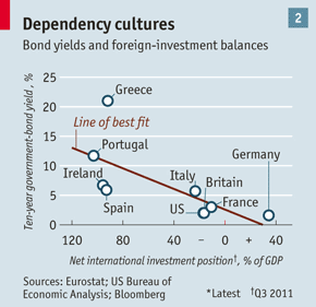 И, наконец, ситуацию осложняет тот факт, что держателями основной части огромного частного долга Испании опосредованно, через банки, являются иностранные инвесторы. Размер чистого дефицита инвестиций – суммы, которую компании, домохозяйства и правительство Испании должны иностранцам, за вычетом размера иностранных активов, которыми они владеют – составляет 93% от ВВП, что является следствием хронического дефицита баланса текущих операций. Усиливающаяся ориентированность европейских инвесторов на внутренние рынки усугубляет положение стран с большим внешним долгом. У Греции и Португалии существуют аналогичные проблемы с уровнем внешнего долга, но в этих государствах стоимость кредитования выше (см. график).