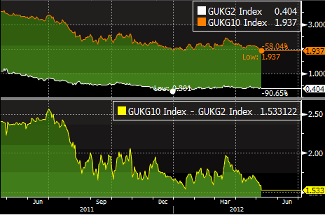 Контраст между экономикой Великобритании и ситуацией в Еврозоне привел к росту интереса инвесторов, избавляющихся от активов в континентальной Европе, к британским государственным облигациям, доходность по которым в последнее время демонстрирует тягу к снижению. Великобритания извлекает для себя пользу из роста пессимизма на рынке облигаций стран Еврозоны, и доходность десятилетних облигаций сегодня упала к уровням середины января. Стабилизация выше них выглядит вполне возможной в краткосрочной перспективе, однако в свете мрачной обстановки в Европе ситуация пока складывается в пользу быков, и аналитики Credit Suisse отмечают, что техническая картина также выглядит конструктивной. Они предупреждают, что прорыв ниже 1.88% подтвердит наличие потенциала для дальнейшего падения доходности к 1.84%, 1.76% -1.75% и, в конечном итоге, к 1.5958%. Сопротивление, между тем, остается в районе 2.06% - 2.10%, и его прорыв необходим для ослабления восходящего давления на британские облигации. В Credit Suisse также полагают, что материализация указанного сценария развития событий (снижение доходности) будет предполагать сглаживание кривой доходности: технически закрытие ниже 1.51% (текущий спрэд 1.533%) откроет дорогу к 1.43% и 1.37%, и для нивелирования рисков такого события необходим рывок выше 1.74%. Источник: ProFinance.Ru - Новости рынка Forex