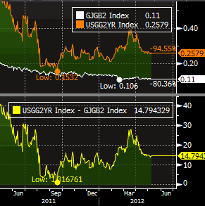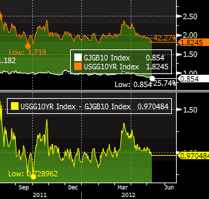 Дилеры отмечают, что обстановка в доллар/иене внушает все меньше оптимизма и на фоне роста пессимизма относительно ситуации в азиатском регионе и отрицательной динамики рынка акций японская валюта ощущает повышенный интерес со стороны инвесторов и и может укрепить свои позиции. Быкам в длоллар/иене не приходится надеяться на поддержку со стороны дифференциалов доходностей, которые по двухлетним облигациям с середины апреля практически не изменились, тогда как по десятилетним спрэд доходности вчера упал к минимальным уровням с начала марта, и дилеры полагают, что риски прорыва ниже Y79.70/50 и последующего снижения к Y78.20 выглядят значительными. Офера экспортеров теперь видны вблизи восьмидесятой фигуры, небольшие стопы остаются на прорыве Y80.10, более крупные по-прежнему ожидаются лишь на прорыве Y80.60/65. Ниже представлены графики спрэдов доходности 2- и 10-летних американских и японских облигаций. Источник: ProFinance.Ru - Новости рынка Forex