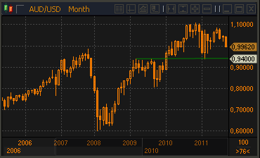 Вместе с тем, среди инвесторов растет беспокойство относительно положения дел в азиатском регионе, что лишает быков по аусси ключевого фактора поддержки, тогда как изменения в дифференциале ставок также носят неблагоприятный для него характер. Развитие событий в Европе подтверждает наши опасения, и мы полагаем, что в ближайшие недели/месяцы можно ожидать ухудшения ситуации, что поддержит дальнейшую корректировку оценок перспектив роста мировой экономики и окажет давление на австралийскую валюту. Стоит также отметить, что не слишком позитивна для последней и обстановка в Австралии: за исключением сырьевого сектора, статистические показатели дают повод для сдержанного оптимизма при оценках состояния экономики, и в ближайшие месяцы стоит ожидать дальнейшего снижения ставок RBA.