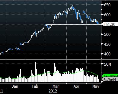Apple со своими позитивными финансовыми показателями и рекордным объемом наличности за последние месяцы стал любимцем публики, в частности особенно активно покупали его хедж-фонды (в феврале число фондов, инвестировавших в акции производителя iPhone достигло рекордных 216), а банки в один голос рекомендовали своим клиентам покупать акции компании. С начала апреля, однако, ситуация начала меняться, и, в то время как спад после бурного ралли выглядел достаточно ожидаемым, вялый характер последовавших попыток роста является поводом для тревоги, предполагая риски более внушительной коррекции. Тяга к тестированию поддержки в области $555/$548 за акцию предполагает окончание эйфории инвесторов, и прорыв ниже грозит развитием снижения к $526, $516 и $500 в ближайшие дни. Источник: ProFinance.Ru - Новости рынка Forex
