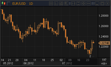 На торгах в пятницу евро/доллар продолжает консолидироваться в области трехнедельных максимумов, ожидая публикации данных по темпам роста ВВП США во втором квартале, которые, по прогнозам, окажутся минимальными за последний год. «Совокупность ожиданий скорого запуска QE3 в США и возобновления покупки бондов ЕЦБ в рамках программы SMP оказывают давление на доллар и поддерживают спрос на рискованные активы», - отмечает Каллум Хендерсон, глава валютных исследований Standard Charteredв Сингапуре. - «Впрочем, инвесторы надеются на это уже давно, однако ничего не происходит. Ситуация в Европе предельно обострилась, и замедление экономики на фоне продолжающегося кризиса суверенного долга не добавляют нам оптимизма по евро. Мы продолжаем ожидать его снижения против доллара до $1.18 к концу текущего квартала».