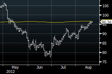 На торгах во вторник нефть сорта WTI продолжает торговаться неподалеку от 3-месячных максимумов, ожидая завтрашней публикации данных по запасам в США, которые, по прогнозам, на прошлой недели выросли на 900 000 баррелей, а также результатов встречи лидеров Германии и Франции, запланированной на четверг. Отметим, что торги продолжают проходить чуть ниже 200-дневной скользящей средней, расположенной в настоящий момент на$96.72. «Участники рынка внимательно следили за тем, что происходило с запасами в США в последние 5-6 недель, и не могли не заметить, что они остаются высокими», - отмечает Билл О'Грейди, главный рыночный стратег Confluence Investment Management. - «Это и довольно мягкий сезон штормов являются главными причинами того, что WTI никак не удается достигнуть отметки $100».
