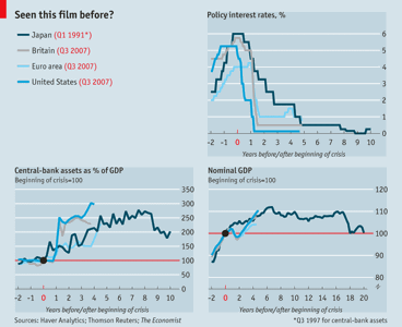 Пять лет назад положение дел выглядел весьма оптимистично. В первую неделю августа 2007 года инвесторы и ключевые Центробанки пророчили Европе и Америке рост на уровне 2-3%. Однако 9 августа все изменилось. Французский банк BNP Paribas объявил о крупных убытках по субстандартной ипотеке. В тот же день ЕЦБ был вынужден закачать в финансовую систему €95 млрд. ($130 млрд.) для поддержки банков. Кризис начался. В течение первого года политики рассматривали Японию как ориентир или, скорее, как предупреждение. Долговой пузырь Японии стал причиной «потерянного десятилетия» (1991-2001 гг.). Аналитики извлекли из этого три урока. Во-первых, чтобы избежать стагнации в стиле Японии, требуются оперативные действия; во-вторых, нужно привести в порядок баланс; и, в-третьих, обеспечить масштабное экономическое стимулирование. Если брать за критерий Японию, Америка и Британия являются комбинированными вариантами. А Еврозона, тем временем, может стать «японской». Долги накапливались в течение нескольких лет. Возьмем американского потребителя. В 2000 году соотношение долга к ВВП составляло порядка 70%. К 2007 году показатель приблизился к 100% от ВВП в результате ежегодного прироста в среднем на 4%. То же самое имеет место быть и в случае с европейскими банками и правительствами: долги разрастались стремительно и неуклонно. Несложно было выявить образования долговых гор. Кризис разразился с осознанием того, что увеличение числа невыплат по ипотечным кредитам с высоким уровнем риска стало повсеместным. Многие активы обесценились. Долги стали неприемлемыми, а процентные ставки подскочили. Это означало, что после постепенного накопления долгов, правительства, потребители и банки неожиданно столкнулись с высокими издержками. Реакция не заставила себя долго ждать. К концу 2008 года Федрезерв, ЕЦБ и Банк Англии понизили официальные процентные ставки. Их целью была нейтрализация скачка стоимости долга, с которым столкнулись компании и потребители. По японским стандартам, снижение стоимости кредитования было стремительным (см. график ниже). Похоже, первый урок был усвоен.