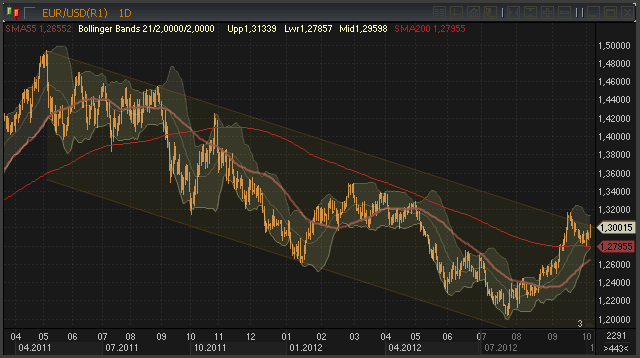 В отличие от рынка золота, где даже в моменты относительно значительных коррекций уверенность трейдеров в росте цен до 1800 долларов за унцию сопоставима с уверенностью в том, что утром взойдет солнце, дальнейшие перспективы пары евро/доллар выглядят неоднозначно, хотя и более оптимистично. После коррекции с максимумов 17 сентября цены снизились до 200-дневной скользящей средней линии и, оттолкнувшись от нее, вернулись на 1.3000. В настоящий момент цены находятся в области значений верхней линии среднесрочного нисходящего канала.