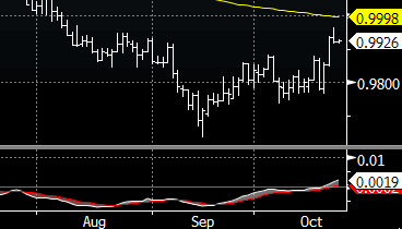 Доллар может продолжить укрепление против луни в случае прорыва выше 200-дневной скользящей средней, расположенной в настоящий момент на отметке C$0.9998, считают в Royal Bank of Canada. «Первую половину сентября пара провела, корректируясь, однако с тех пор доллар серьезно укрепил свои позиции», - пишет Джордж Дэвис, главный технический аналитик банка в Торонто. - «Теперь дневное закрытие выше 200-дневной МА подтвердит силу среднесрочного аптренда и подаст сигнал о смене настроений на рынке». Отметим, что в настоящий момент значение дневного MACD составляет 0.0019, а сигнальной линии - 0.0002, что является максимальным расхождением с 3 октября и подтверждает наличие потенциала для дальнейшего роста пары. Источник: ProFinance.Ru - Новости рынка Forex