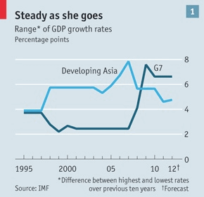 Лаос - бедная страна с населением 6 млн. человек, вклинившаяся между Вьетнамом и Таиландом. У нее нет выходов к морю. Ей нечем привлечь внимание внешнего мира. Но сейчас Лаос переживает свой звездный час. В прошлом месяце страна получила одобрение на присоединение ко Всемирной торговой организации. На этой неделе в ней прошел азиатско-европейский саммит, на котором встретились главы не только наиболее динамично развивающихся, но и отстающих регионов в мире. У Лаоса крохотная экономика, ориентированная на экспорт золота, меди и гидроэнергии. При этом она может похвастаться одними из самых высоких темпов роста в мире, и выдающейся стабильностью. С 2002 по 2011 годы темпы роста колебались в поразительно узком диапазоне: они ни разу не опускались ниже 6.2%, и никогда не поднимались выше 8.7%. Помимо Лаоса всего лишь три страны могут похвастаться аналогичной стабильностью за указанный период (с учетом стандартного отклонения). Две из них также находятся в Азии: это Индонезия и Бангладеш. Развивающаяся Азия наслаждается стабильным развитием, превышающим темпы роста "зрелых" экономик стран Большой семерки (см. график). За период с 2002 по 2011 годы их экономики заметно стабилизировались по сравнению с показателями предшествующих десятилетий. Период экономического спокойствия, доминировавшего в Америке и других богатых странах перед финансовым кризисом, получил название эпохи "Великого успокоения". Можно ли сегодня использовать этот термин по отношению к Азии? Экономики этого региона, как правило, славятся скоростью, но никак не стабильностью. Например, с 1996 года по 1998 темпы роста в пяти экономиках юго-восточной Азии (Индонезия, Малайзия, Филиппины, Таиланд и Вьетнам) от 7.5% обрушились к -8.3% в результате азиатского финансового кризиса. Даже сейчас наиболее открытые экономики, в первую очередь, в Таиланде, Сингапуре и Тайване, более волатильны по сравнению со средними мировыми показателями. Они зависят от международных потоков капитала, поэтому объемы их производства движутся в унисон с мировым спросом.