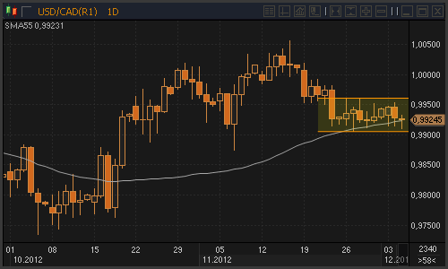 Дело вовсе не в том, что канадская валюта испытывает нехватку рыночных драйверов для развития направленного движения. Дело в том, что все факторы, которые могли бы привести к этому движению, игнорируются в пользу неопределенности двух наиболее важных на данный момент вопросов. Первый из них – ситуация с финансовым дисбалансом в США (fiscal cliff). Второй – отчет по рынку труда в США за ноябрь. Каждый из этих факторов имеет потенциал вывести курс доллар/канада из диапазона. Поэтому весьма вероятно, что диапазонная торговля сохранится до последнего торгового дня недели, чем вполне могут воспользоваться краткосрочные спекулянты. Импульсные инвесторы, как ожидается, включатся в игру по факту пробития той или иной линии установленного диапазона. Источник: ProFinance.Ru - Новости рынка Forex