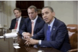 Любимая шутка Роберт Фроста: "либерал - человек слишком широких взглядов, чтобы занять собственную сторону в ссоре". (Очевидно, авторство этого высказывания принадлежит Уильяму Эрнесту Хоккингу, профессору философии Гарвардского университета, в 1942 году.) С одной стороны, возможно, Обама считал свое президентство выше борьбы в Конгрессе, выступая посредником в компромиссе. Но, кажется, что сейчас не время для подобной позиции. Действия сторон в современной американской политике не позволяют республиканцам доверять Обаме, когда он пытается заранее быть миротворцем. И, видимо, Обама решил, что, по крайней мере, в обсуждении фискального обрыва, ему лучше выступить в качестве заинтересованной стороны, а не миротворца.