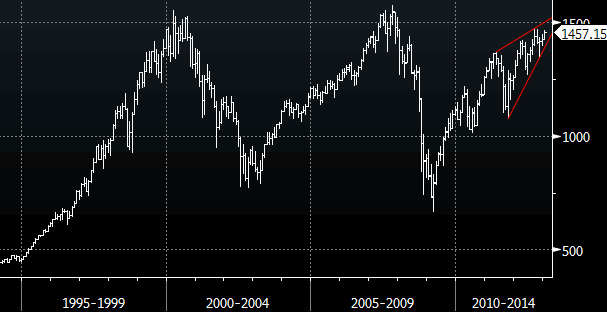 Четырехлетний рост фондового рынка США, начавшийся в 2009 году, может завершиться снижением S&P 500 на 30% к началу следующего года, считают технические аналитики UBS. «К лету нынешнего года индекс может подняться еще на 7.4% до отметки 1570, в результате чего его рост с минимума 2009 года составит 116%», - пишут технические стратеги банка в Цюрихе. - «Текущий бычий цикл, по нашему мнению, входит в завершающую стадию, и после формирования максимума в текущем году S&P 500 может возобновить более долгосрочный даунтренд, начатый в 2000 году. Формирующийся на графиках «восходящий клин» является сильным медвежьим сигналом». Источник: ProFinance.Ru - Новости рынка Forex