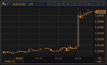 Экономическая статистика из Австралии преподнесла инвесторам еще одни приятный сюрприз, и, в то время как рост занятости в феврале в значительной степени зиждился на увеличении числа мест с неполным рабочим днем, общий показатель был впечатляющим. Аусси за несколько секунд подскочил от $1.0300 к уровням вблизи $1.0370, и в настоящее время продолжает пользоваться спросом. Дилеры отмечают, что риски теперь смещены в пользу тестирования сопротивления в районе $1.0400, от способности закрепиться выше которого будут зависеть дальнейшие перспективы развития ситуации. Источник: ProFinance.Ru - Новости рынка Forex