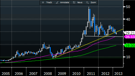 Думаю, падать дальше некуда, несмотря на данные всяко разные. Учитывая, что серебро копирует поведение золота, вместо падения вниз увидим топтание вокруг 29 долларов за унцию. Соответственно, и золото будет крутиться вокруг 1600. Вчера была хорошая медвежья подвига по серебру. Но уровень в 28,5 устоял без напряга. Оный даже не коснулись. До максимального провала - до 28 - повторно не добрались. Даже близко. Разумеется, не факт, что медвежьи повадки утихнут, но серьёзного опасения медвежатники уже не внушают. Нисходящий так называемый трэнд с 4 октября, в теории, выдыхается. Графики показывают его затухание. И вчерашние медведи моментально перекрасятся в быков (как коммунисты в демократов). Если бы ФРС объявило о сворачивании КуЕ, тогда ДА! Серебро бы улетело и ниже 26 за кратчайший срок. И продолжило бы лавинообразно падать чёрт знает до куда. Но КуЕ будет продолжаться. Сворачивание стимуляции не видно и еще долго не будет видно. Мало того, кроме штатовцев, европейцы свои евро как туалетную бумагу пользуют. К этим двум грандам еще и японцы занялись тем же самым. Так что не падать духом! Золото и серебро будут отрастать при любых раскладах. Порядок, Граждане! Поэтому смело можно утверждать, |