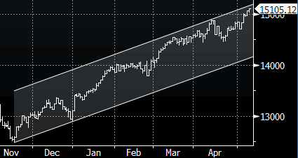 После исторического закрытия во вторник выше отметки в 15000 пунктов Dow Industrial продолжил рост и на следующий день, достигнув новых рекордных высот, благодаря сильным отчетам целого ряда компаний, например, Whole Foods Market и Electronic Arts. «Нервозность, царившая на рынке в апреле, ушла и ключевые фондовые индексы, такие как Dow и S&P 500, взяли новые важные психологические рубежи в 15000 и 1600, соответственно», - отмечает Питер Янковскис, инвестиционный директор Oakbrook Investments. – «Сезон отчетности заканчивается, и теперь дальнейшую динамику рынка будет определять макроэкономическая статистика». Отметим, что, по данным Bloomberg, в настоящий момент акции восьмидесяти шести процентов компаний из S&P 500 торгуются выше своих 50-дневных МА, что является максимальным значением с 13 февраля, однако немного не дотягивает до двухлетнего максимума в девяносто три процента, достигнутого в январе. Источник: ProFinance.Ru - Новости рынка Forex