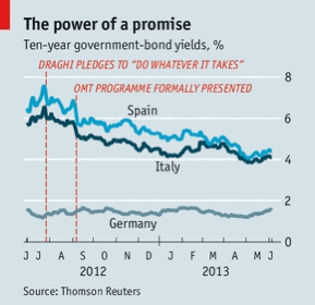 Эта политика получила название «прямые денежные операции» (ОМТ) - это дело, которое последовало за словами Центробанка, пообещавшего в июле 2012 года «сделать все, что потребуется для спасения евро». ОМТ оказалась мощным инструментом именно благодаря тому, что ЕЦБ впервые обязался покупать облигации в неограниченных количествах (на вторичном рынке). Прежде облигации покупались Центробанком периодически и бессистемно, начиная с 2010 года, когда разразился еврокризис. Перспектива неограниченных покупок смягчила спекулянтов, которые делали ставку на развал валютного союза. Фактически, идея ОМТ оказалась настолько успешной, что ее до сих пор так и не пришлось применить на практике. Однако теперь в детали этой доктрины будут вникать не инвесторы, а судьи. Немецкий суд будет рассматривать политики ЕЦБ, включая ОМТ, вместе с вопросом об участии Германии в фонде помощи Еврозоны (которое было санкционированы предварительным решением в сентябре). Судьи будут предельно осторожны: скорее всего, ОМТ переживет это событие. Однако сам факт слушаний обнажит глубокий раскол в самом сердце ЕЦБ.