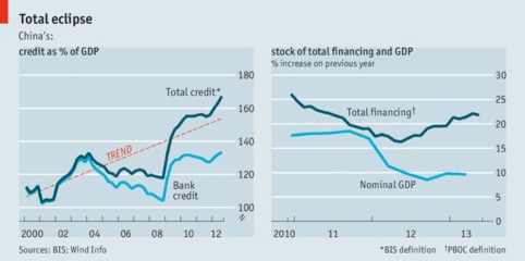 Чжанг не единственный, кого беспокоит сложившаяся ситуация. Объем кредитов стал одной из главных причин снижения суверенного рейтинга агентством Fitch в апреле. Китайские политики тоже не дремлют. В марте регулирующий орган призвал банки подчистить свои забалансовые инвестиции. В прошлом месяце валютный регулятор Китая принял жесткие меры против незаконных притоков капитала. Чуть раньше в этом месяце центральный банк Китая провел интервенцию, поскольку межбанковские ставки кредитования взмыли под облака в преддверии праздника драконьих лодок (по некоторым данным, в результате дефолта одного банка средней руки по обязательствам другого такого же банка). Власти стремятся сбавить скорость, чтобы не допустить образования пузырей. В мае Центробанк наконец-то сократил объемы своего «общего социального финансирования» (TSF). У стремительного роста кредитования в Китае есть оборотная сторона - номинальный ВВП растет удивительно медленно. В первом квартале социальное финансирование достигло рекордных объемов, но рост остался слабым, и инфляция никуда не сдвинулась. И оптимисты (уверенные в том, что потоки кредитов стимулируют восстановление), и пессимисты (опасающиеся быстрого роста инфляции) оказались сбитыми с толку.