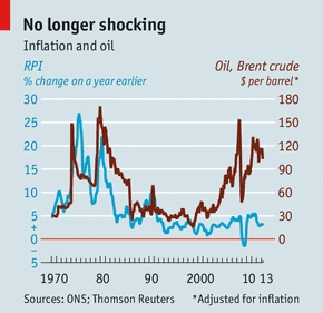 Тщательно проанализированный, этот строй сработал блестяще. В период между 1992 и 2012 годом среднее значение инфляции в розничных продажах составляло около 3%. В течение двух предшествующих десятилетий оно держалось в области 10%. Помогли товары, импортированные по низкой цене. Однако при Сэре Мервине система столкнулась с суровыми испытаниями и выстояла. Две волны роста цен на нефть, в 2008 и 2011 году, были похожи на волны в 1970-х. Они не привели к инфляции в стиле 1970-х (см. график). Сэр Мервин не был основоположником целевого значения инфляции - Новая Зеландия применила его раньше Великобритании - но именно он его популяризировал. Он использовал сеть своих университетских связей, созданную в Америке, чтобы заполнить своими людьми ключевые руководящие позиции в Центробанке и МВФ. Эти связи и успех Великобритании в контроле над инфляцией придали Сэру Мервину мировой вес. В 1992 году насчитывалось всего три человека, определяющих целевое значение. На сегодняшний день их больше 30.