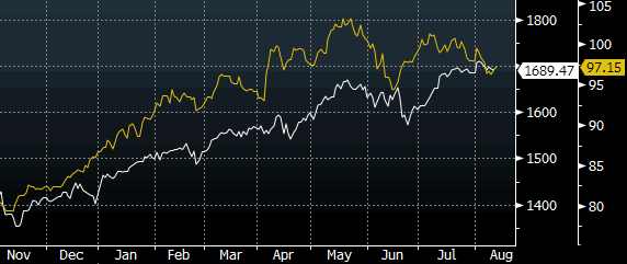 Роберт Слюмер, технический аналитик RBC Capital Markets, отмечает, что с ноября 2012 года по май 2013 года между S&P 500 и доллар/иеной наблюдалась сильная положительная корреляция, однако затем их пути разошлись: американский рынок акций достиг рекордных значений, а вот валютной паре не удалось обновить майских максимумов. «На данную дивергенцию стоит обратить внимание, учитывая, что снижение иены против всех основных валют, в результате которого она стала главной валютой фондирования, являлось важнейшим катализатором роста рискованных активов», - отмечает господин Слюмер. – «На наш взгляд, снижение доллар/иены ниже Y94 будет означать возобновление даунтренда и иметь негативные последствия для рынка акций. В этом случае будет необходимо внимательно следить за отметками 1573 (июньский минимум S&P 500) и 1560 (200-дневная МА)». Источник: ProFinance.Ru - Новости рынка Forex