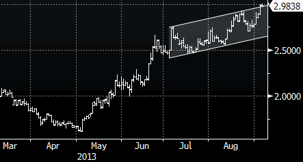 Евро/доллар готовится закрыть снижением вторую неделю подряд на фоне роста доходности 10-летних бондов Казначейства США до двухлетнего максимума (3%) и в преддверии публикации в США данных по рынку труда. Иена растет против большинства основных валют после довольно сильного снижения Nikkei 225 (-1.45%), а фунт/доллар и аусси/доллар корректируются после вчерашнего падения. «Спрос на американскую валюту сохранится», - считает Кикуко Такеда, старший аналитик BTMU в Лондоне. – «Я не думаю, что ФРС особенно внимательно следит за поступающими данными, пытаясь найти аргументы за или против сокращения объема QE3. Это – вопрос решенный, и изменить ситуацию может лишь публикация каких-то шокирующих цифр». Напомним, что, по последним данным CFTC, по состоянию на 27 августа чистая спекулятивная длинная позиция в доллар/иене составляла 78 353 фьючерсных и опционных контракта против шестилетнего максимума в 99 769 контрактов, установленного в мае. Источник: ProFinance.Ru - Новости рынка Forex