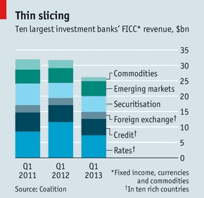 Федрезерв пересматривает решение 2003 г., позволившее Citigroup и другим банкам с Уолл-Стрит в целом, заключать сделки с реальным товаром, которые являются дополнением к их финансовой деятельности. Чтобы определить, что является дополнением, а что нет, нужно принять соломоново решение подобное тому, которое потребовалось для отделения собственных торговых операций от поддержания котировок ценных бумаг на организованном рынке. Следует ли запретить банкам финансировать сырьевые товары, если иногда это требует их физической поставки? Перспективы того, что контрольные органы продолжат заниматься этим вопросом, не говоря уже о борьбе с американскими потребителями пива, подталкивает некоторые банки к тому, чтобы дать свой ответ. Банк JPMorgan Chase внезапно заявил об уходе из сферы торговли реальными товарами, потратив уйму времени и денег с момента образования таких видов деятельности во время кризиса. У банков есть и множество других причин, чтобы переосмыслить свое отношение к бизнесу, связанному с сырьевыми товарами. Ограничение капитала означает, что для банков вполне естественно пересматривать принадлежащие им неликвидные капиталоемкие активы. Конкуренция со стороны торговых фирм заметно выросла. Недавний отчет консалтинговой компании McKinsey показывает, что число фирм, торгующих сырьевыми товарами, только в Женеве увеличилось с 200 в 2006 г. до 400 в 2011 г. Относительная стабильность цен на нефть в последние несколько лет привела к тому, что у банков стало меньше возможностей для получения прибыли от торговли. По данным исследовательской компании Coalition, в последние шесть кварталов прибыль десяти ведущих инвестиционных банков от сырьевых товаров сократилась (см. график).