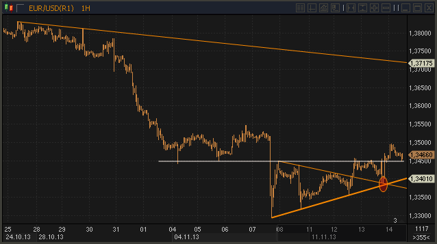 После тестирования минимумов в области 1.3295, сформированных 7 ноября, цены в паре евро/доллар вошли в стадию консолидации, которая на часовом графике привела к формированию сходящегося треугольника. Традиционно такой треугольник является фигурой продолжения тренда, а, следовательно, существовала более высокая вероятность пробития его нижней линии. Однако в ходе торгов 12 ноября цены преодолели верхнюю линию треугольника. Затем была предпринята попытка возобновить нисходящую динамику. Она была пресечена областью поддержки, где сошлись продолжение верхней линии ранее покинутого треугольника и нижняя линия треугольника, выступающая в краткосрочной перспективе технической поддержкой (красный круг на графике ниже). В результате цены поднялись выше ключевого технического сопротивления 1.3450, затем протестировали его уже в качестве поддержки и в настоящий момент остаются немного выше.