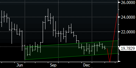 Последние два месяца серебро провело, консолидируясь в узком для данного металла семипроцентном диапазоне. Принимая во внимание продолжительность данной консолидации, а также ряд серьезных перемен (в том числе и психологических, а также начало сворачивания QE3, слом долгосрочных корреляций внутри различных классов активов, а также между ними), недавно имевших место на рынках, можно предположить, что в ближайшее время мы увидим мощные движения. Учитывая горизонтальный характер консолидации и близость важных уровней поддержки (июньский и декабрьский минимумы прошлого года), соблазн их протестировать, пробить и высадить оставшихся быков может оказаться весьма велик. Поэтому нашим базовым сценарием развития событий является следующий: отвесное падение в диапазон $16.50-$17.50 с последующим резким отскоком и уходом наверх (первоначально в область $23-$25). Сыроваткин Олег Источник: ProFinance.Ru - Новости рынка Forex