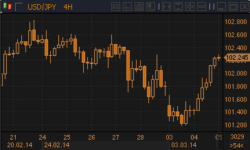 Во вторник иена сильно подешевела против всех основных валют (прим. ProFinance.ru: рост доллар/иены оказался максимальным за последние семь недель), утратив все достигнутое накануне, на фоне некоторой разрядки обстановки в Крыму. Фьючерсы на Nikkei 225 прибавляют около 1%, однако, как и доллар/иена, подошли к важному сопротивлению (отметка 15 000). Уверенный прорыв пары выше 21-дневной МА на Y102.25 откроет дорогу для теста февральского максимума и верхней границы 21-дневной ленты Боллинджера около Y102.80. По словам дилеров, стопы отмечены выше Y102.30 и ниже Y101.75. Источник: ProFinance.Ru - Новости рынка Forex