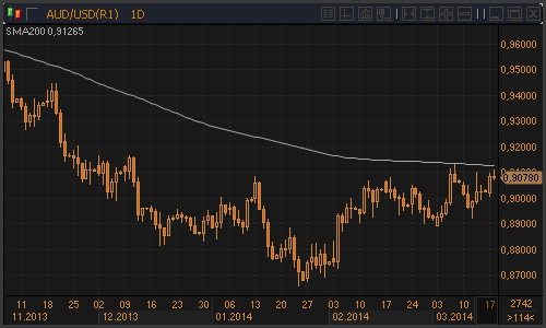 Публикация протокола мартовского заседания Резервного Банка Австралии оказала краткосрочную поддержку аусси. «Протокол подтвердил то, что ранее заявлял Центробанк. Они будут сохранять процентные ставки на текущем уровне в течение какого-то времени», - комментирует ситуацию Яну Чан, экономист из St. George Bank в Сиднее. В отношении курса австралийского доллара в протоколе была применена следующая формулировка: «Реализованное снижение курса будет оказывать помощь в достижении сбалансированного роста экономики, хотя по историческим меркам курс остается высоким». Macquarie Bank пересмотрел свой прогноз по динамике процентной ставки РБА. Теперь эксперты банка не ожидают снижения ставки в 3 квартале 2014 года и ожидают, что Центробанк Австралии начнет повышение ставки во втором полугодии 2015 года. После краткосрочной позитивной реакции на публикацию протокола австралийский доллар оказался под давлением, поскольку вся позитивная для аусси информация уже учтена рынком и заложена в цены. Также следует учитывать технический фактор. Область выше фигуры 0.9100 представляет собой прочное сопротивление, которое венчается текущим значением 200-дневной скользящей средней линии. На данный момент движущих факторов для уверенного вхождения в область цен выше 0.9100 у австралийской валюты нет. Если они не появятся в ближайшей перспективе, то технически мы будем получать формирование двойной вершины, увеличивающей вероятность возобновления годового медвежьего тренда. Источник: ProFinance.Ru - Новости рынка Forex