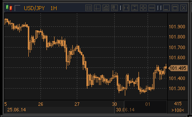 Доллар/иена начал утреннюю сессию на Y101.32 и провел ранние часы между Y101.30 и Y101.36 в тихих сделках. Он держался на Y101.32, когда были опубликованы результаты квартального опроса Tankan Банка Японии. Пара после этого снизилась на несколько пунктов, отметив утренний минимум Y101.29. Tankan отметил некоторый положительный сдвиг в оценках респондентов. Крупные компании Японии намерены увеличить капвложения в текущем финансовом году, начавшемся 1 апреля, на 7,4% по сравнению с 0,1%, ожидавшимися в первом квартале. Кроме того, фирмы дают сравнительно оптимистичный прогноз на следующий квартал, ожидая повышения индекса к сентябрю до 15 пунктов с 8 пунктов. При этом значение индекса для крупнейших предприятий во втором квартале оказалось хуже ожиданий - 12 пунктов против 15 (консенсус) и 17 пунктов в январе-марте. Однако сильное открытие японских акций привело к отскоку доллар/иены к Y101.50, а Nikkei 225 вырос более чем на 1%. Рост первоначально остановился на этом уровне, но получил продолжение, когда евро/иена вырос вслед за публикацией данных по PMI Китая. Рассчитываемый китайскими властями индекс менеджеров по закупкам (PMI) в перерабатывающей промышленности вырос по итогам июня до 51 пункта с 50,8 в мае, как и ожидалось. Неофициальный промышленный PMI Китая, рассчитываемый HSBC и Markit, поднялся в прошлом месяце до 50,7 пункта с 49,4 пункта месяцем ранее. Предварительное значение за июнь составляло 50,8 пункта, и экономисты не ожидали пересмотра. Евро/иена поднялся до максимума Y138.98 с раннего минимума Y138.69, а доллар/иена продолжил рост к Y101.54. Умеренные офера стоят на Y101.50, а прорыв позволит паре снова нацелиться на 200-дневное скользящее среднее значение на Y101.73 в настоящее время, а дальнейшие предложения на продажу отмечены на Y101.80. Евро/иена продолжил рост в тандеме с евро/долларом в реакции на более лучший, чем ожидалось, итальянский PMI (48,2 против среднего прогноза в 47,8). Пара поднялась к Y138.98, повторно протестировав ночной максимум. Предложения на продажу остаются на подходе к Y139.00 со стопами, установленных на прорыве Y139.10 (Y139.13 - 200-дневное скользящее среднее значение).
