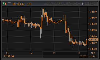 Забегая вперед, на этой неделе ждем данные по инфляции (HICP), ВВП за второй квартал, решение FOMC в среду, июльский отчет по занятости в США (NFP) и ISM Manufacturing в пятницу. Они должны привести к возрастанию волатильности. По оценкам опрошенных Bloomberg экономистов, ВВП США в апреле-июле вырос на 3% в годовом выражении после падения на 2,9% в первом квартале. Министерство торговли США обнародует эти данные 30 июля в 16.30 мск. В пятницу министерство труда США опубликует данные о безработице за текущий месяц. Число новых рабочих мест составит в июле 228 000 против 262 000 в июне, а безработица останется на уровне 6,1%, прогнозируют экономисты. Федеральная резервная система проведет очередное заседание, по итогам которого, как ожидается, продолжит сворачивание программы количественного смягчения. "Реакция ФРС на сильные данные, опубликованные за последнее время, очень интереса, однако решения американского регулятора полностью зависят от того, что будет происходить дальше, - говорит старший валютный аналитик ANZ Bank New Zealand Ltd. Сэм Так. - Доллар, вероятно, продолжит дорожать. Стоить ожидать сохранения давления на евро в краткосрочной перспективе". Судя по низкой доходности американских государственных облигаций, рынок не изменил прогноз по американской экономике, и ФРС, скорее всего, сохранит мягкую политику на совещании на этой неделе. Хотя по оценкам аналитиков Barclays, инвесторы могут изменить мнение после публикации цифр по ВВП и занятости. "В целом мы ожидаем достаточно неплохие данные, которые должны поддержать доллар на этой неделе. Мы не ждем от ФРС особых сюрпризов, скорее всего, будет объявлено о сокращении еще на $10 миллиардов".