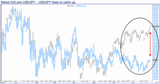 Из представленного ниже графика видно, что Nikkei и доллар/иена, традиционно, сильно коррелируют, однако в последнее время эта корреляция нарушена. Эксперты Citigroup считают, что скоро она будет восстановлена, причем именно путем бычьего ралли в доллар/иене. Недельное закрытие по индексу Nikkei 225 произошло выше «линии шеи» для двойного дна. На текущей неделе восходящее движение имеет перспективы продолжения с формированием новых максимумов по индексу. Такое мнение высказывают технические специалисты Citi. Учитывая этот факт, а также то, что в последние дни курс доллар/иена также демонстрирует уверенный рост, стратеги банка ожидают, что темпы роста доллара против иены «догонят» восходящий тренд по Nikkei. Курс доллар/иена находится внутри сходящегося треугольника, текущее значение верхней линии которого находится в районе 102.50. Эксперты Citi ожидают пробитие верхней линии треугольника и рост до апрельских максимумов в районе 104.30. Эта же отметка является вершиной более масштабной среднесрочной фигуры «двойное дно». Пробитие этого уровня приведет к достижению цели на 107.50. В соответствии с подобными размышлениями, в техническом портфеле Citi открыто условно две длинных позиции в доллар/иене. По первой целью является уровень 105.00. По второй позиции целью выступает уровень 110 иен за доллар. Источник: ProFinance.Ru - Новости рынка Forex