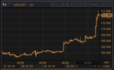 Это была особенная сессия для доллар/иены с момента его открытия на Y109.21 сегодня утром. Доллар/иена торговался на максимальном уровне Y109.48 вчера в США, отчасти из-за новостей о планах GPIF Японии перераспределить инвестиции в большей степени на внутренние акции вместо облигаций. Эти планы широко обсуждались в последние недели, и участники рынка ждали окончательного подтверждения подобного перераспределения, возможно, сегодня. Позднее поступили новости о снижении доли вложений во внутренние облигации с 60 % вдвое. В начале сегодняшнего утра доллар/иена поднялся с уровня открытия, но дальнейший прогресс вначале был ограничен нью-йоркским максимумом на Y109.40. Релиз данных по ИПЦ Японии, как и вышедшие в то же время данные по расходам домохозяйств и вакансиям, не вызвали массивной реакции первоначально, а доллар/иена держался вокруг Y109.30/35. Самый значительный шаг, однако, пришелся уже после того, как Банк Японии объявил неожиданное решение расширить программу покупки активов. Это было словно гром среди ясного неба. Никто из авторитетных банков не ожидал в последнее время таких решений от регулятора. Доллар/иена подскочил через офера на Y109.50 и Y110.00, сорвав стопы выше последней отметки. Он постоял немного, а затем продолжил ралли, пробив максимумы 2014 на Y110.09, а далее зацепил стопы на Y110.20 и преодолел максимум Y110.31, установив самый высокий показатель с августа 2008 года, когда пара была на Y110.20, и продолжал цепляться за новые максимумы после ударного решения Банка Японии. "Это решение - очень негативный сигнал для иены, - отмечает аналитик Citigroup Inc. в Сингапуре Тодд Элмер. - Со временем курс иены опустится до Y112". На пресс-конференции глава Банка Японии Курода благотворно для японской экономики оценил последнее снижение курса иены, дав зеленый свет на продолжение аптренда в паре с долларом.