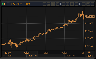 Курс иены падает за счет сверхдешевых кредитов Банка Японии, позволяющих использовать валюту как источник фондирования. Ослаблению иены также способствуют ожидания дальнейшего стимулирования вошедшей в рецессию экономики страны правительством во главе с премьер-министром Синзо Абэ. Ранее на этой неделе Абэ объявил о роспуске нижней палаты парламента с 21 ноября и проведении досрочных выборов, и большинство экспертов уверены в том, что партия премьера выиграет выборы, что позволит властям продолжить стимулирующую политику. Опубликованный в среду протокол октябрьского совещания ФРС показал, что руководство американского регулятора не беспокоится по поводу укрепления доллара в отличие от центробанков других стран, предпочитающих ослабление национальных валют. "ФРС позволяет доллару продолжать рост. Пара доллар/иена еще далека от уровня, на котором начнется фиксация прибыли, это произойдет вблизи отметки 120 иен", - сказал директор по стратегии на валютном рынке Deutsche Bank Алан Раскин. Почти 40 % опрошенных банком Citibank клиентов ожидают, что доллар превысит Y120 к концу года.