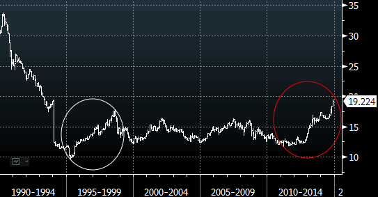 Прецедент уже был в 1997-1998 годах, с единственным исключением: тогда азиатские и развивающиеся центральные банки не обладали такими валютными резервами - общий объем мировых валютных резервов не превышал 2.0 трлн. долларов, а сейчас он уже перевалил за отметку 13 трлн. долларов, при этом большая его часть осела в Азии. И все же подобные валютные войны не приносят желаемых результатов, в этом контексте утверждение Драги о том, что программы QE в США и Японии привели к значительной валютой девальвации, вызывает лишь кривую усмешку. Однако он, фактически, расписался в том, что стремится к ослаблению евро. В настоящее время стоит уделить особо пристальное внимание кросс-курсу юань/иена, который стремительно рос в преддверии азиатского кризиса 1997-1998 года, и затем столь же стремительно рухнул. Сейчас мы наблюдаем аналогичных быстрый рост. История повторяется? Источник: ProFinance.Ru - Новости рынка Forex