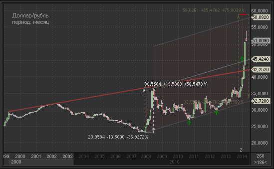 Как видно на графике, июльские минимумы 2008 года и февральские максимумы 2009 года сформировали в данной валютной паре восходящий канал, нижняя граница которого неоднократно проверялась на прочность в 2011 и 2013 годах (зеленые стрелки). Однако она выполнила роль поддержки. В ноябре 2014 года верхняя линия данного восходящего канала была безапелляционно пробита, что технически является сигналом входа в принципиально новый диапазон цен с потенциальным сроком жизни несколько лет. Новый диапазон также отмечен на графике, имея текущее значение нижней границы приблизительно на уровне 45.42 рубля за доллар, а верхнюю границу на уровне около 58.08 рубля за единицу американской валюты.