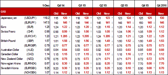 Nomura сегодня опубликовал обновление своего глобального валютного прогноза, которое в основном отражает сдвиг в сторону большей слабости евро, иены, а также валют стран экспортеров энергоресурсов. «Процесс распределения активов будет продолжать оказывать негативное влияние, как на евро, так и на иену. В частности, сильный отток портфельного капитала из еврозоны будет продолжаться в 2015 году. Снижение цен на нефть может также иметь негативные последствия с точки зрения распределения портфельных потоков», - отмечают в своих комментариях эксперты Nomura. В дополнении к глобальным перспективам стратеги брокерского дома обращают внимание на тот факт, что события текущей недели (заседание ЕЦБ) могут открыть дверь для новых покупок активов со стороны Центробанка, что позволит паре евро/доллар до пятницы пробить уровень 1.2400. Nomura прогнозирует курс евро/доллар на 1.22 к концу текущего года и на уровне 1.20 в 1 квартале следующего года.